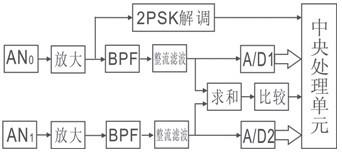 感應(yīng)無線位置檢測系統(tǒng)電路框圖如圖5所示。當(dāng)中控室地面局開始發(fā)送載波信號時,DCD=1;CPU檢測到DCD后,對2PSK解調(diào)輸出檢測,將第1個1作為起始位進(jìn)行串行數(shù)據(jù)接收,得到APD位置數(shù)據(jù)g;在檢測G0的時間段,啟動A/D1和A/D2,從A/D1和A/D2讀出接收線圈0接收的信號幅度A(AN0)和接收線圈1接收的信號幅度A(AN1),將各數(shù)據(jù)代入公式(5)~(8),可得移動機(jī)車位置ADD。