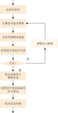 壓電式爆震傳感器的線性度檢測主要通過連續(xù)改變振臺的振動頻率,即采用掃頻的方式,將振臺的振動加速度穩(wěn)定在設定范圍內,對各個頻率下的傳感器靈敏度進行檢測,輸出各個靈敏度與頻率相對應的連續(xù)曲線,并檢測該曲線是否符合該傳感器產(chǎn)品的線性度要求,其測試流程如圖1所示。