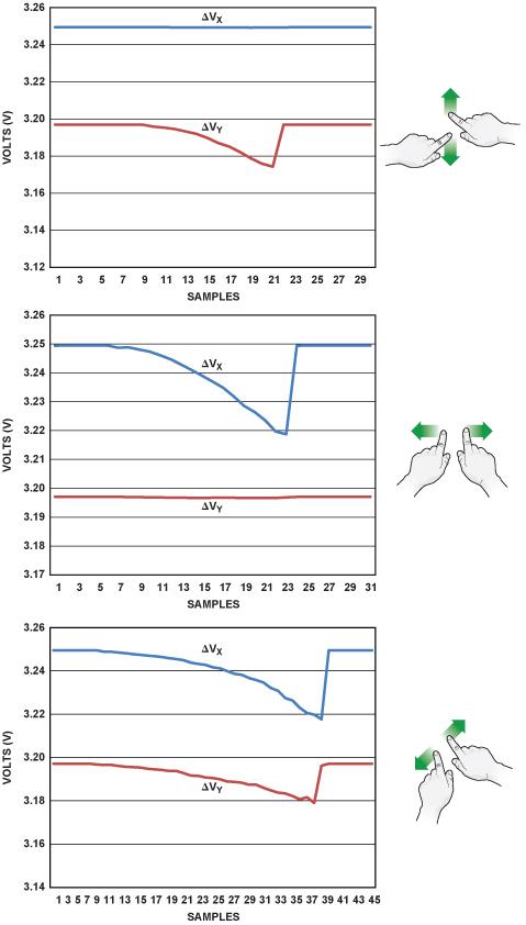 圖 3 顯示了一個(gè)沿著垂直(Y)軸捏合的例子。當(dāng)手勢(shì)開始時(shí),其中一層的兩根電極之間的電壓恒定不變,另一層則表現(xiàn)出階躍性降低,然后隨著手指相互靠近而提高。