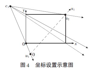 假設(shè)虛擬觸摸屏是如圖4所示的矩形區(qū)域,以左下角為原點(diǎn),建立二維坐標(biāo)平面x、y。左邊攝像頭c1位于虛擬觸摸屏左上角某處,其視角范圍應(yīng)包含整個矩陣區(qū)域,將c1與矩形的4個頂點(diǎn)連接構(gòu)成攝像頭拍攝各點(diǎn)的光線方向,以經(jīng)過左下角和右上角頂點(diǎn)的光線方向?yàn)檠琧1為頂點(diǎn)作一個等腰三角形,底為虛線所示的(u1,u2)。當(dāng)手指在矩形區(qū)域內(nèi)任意一點(diǎn)觸摸時,其在攝像頭所拍攝的圖像中均表現(xiàn)為虛線上的一點(diǎn),手指在二維虛擬觸摸屏上的移動投影到圖像上不會超過這條虛線(u1,u2)范圍,這是算法關(guān)注的興趣區(qū)域,區(qū)域以外的部分不需要處理。因此以u1為原點(diǎn)沿著虛線方向建立一維坐標(biāo)x1,右邊攝像頭拍攝圖像中的一維坐標(biāo)x2類似設(shè)立。
