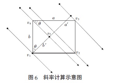 同時初始設(shè)置時可以根據(jù)虛擬觸摸屏的長寬和每個棋盤格在圖像上的投影確定攝像頭拍攝的每個棋盤格平行光的斜率。放大圖5 中的棋盤格s,得到圖6。假設(shè)攝像頭c1以斜率k平行拍攝由頂點(diǎn)v1、v2、v3、v4組成的棋盤格s,其邊(v4,v3)的長度為a,在圖像平面上的投影(v3,v5)的長度為a′,其邊(v1,v4)的長度為b,在圖像平面的投影(v1,v5)的長度為b′。已知虛擬觸摸屏的長寬,每個棋盤格的長a 和寬b 分別為其1/n,a′、b′可從拍攝的圖像上獲得,于是從攝像頭拍攝該棋盤格的平行光的斜率k 可由下式獲得: