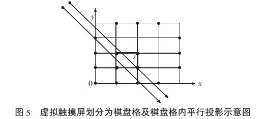 具體實(shí)施中,為準(zhǔn)確識別手指位置,將虛擬觸摸屏劃分為n×n 的棋盤格,如圖5 所示,由于攝像頭離棋盤格距離較遠(yuǎn),且每個棋盤格足夠小,于是可以假設(shè)在棋盤格內(nèi),攝像頭拍攝的光線是平行的,以簡化點(diǎn)位置的轉(zhuǎn)換。