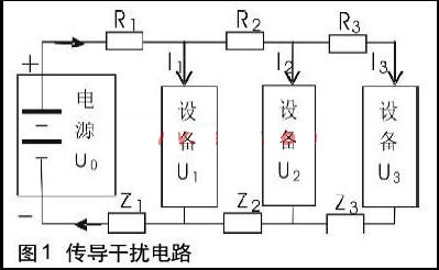 傳導(dǎo)干擾主要通過電路的共用導(dǎo)體傳播,典型的結(jié)構(gòu)是共電源線和共地線,圖1是典型傳導(dǎo)干擾電路示意圖。R為電源線上電阻,Z為地線上電阻,U為支路電壓,I為支路電流。