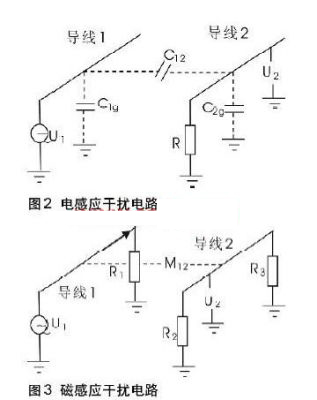 感應(yīng)干擾分為電感應(yīng)干擾和磁感應(yīng)干擾兩種,其基本電路圖如圖2和圖3。U1為導(dǎo)線1的電壓,I1為導(dǎo)線1上電流,U2為導(dǎo)線2上的干擾電壓,C12為兩導(dǎo)線間的電容,C1g和C2g為導(dǎo)線1、導(dǎo)線2與地的電容,M12為兩回路間互感,R為各電路的電阻。