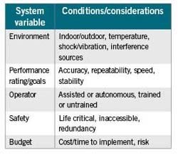 MEMS慣性傳感器可靠度高(汽車行業(yè)20年的應(yīng)用歷史證明了這一點),它在手機和視頻游戲中的成功應(yīng)用說明它在商業(yè)上極具吸引力。然而,不同應(yīng)用對性能的要求大不相同,適合游戲的器件并不能解決本文所述的高性能導航問題。對于導航,重要的MEMS性能指標是偏置漂移、振動影響、靈敏度和噪聲。精密工業(yè)和醫(yī)療導航所需的性能水平通常比消費電子設(shè)備所用MEMS傳感器的性能水平高出一個數(shù)量級。表3列出了有助于傳感器選型的一般系統(tǒng)考慮。