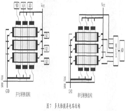 于是基本電路構(gòu)架便可以分為串行和并行兩種,如圖7 所示。值得注意的是,圖6 僅表現(xiàn)了坐標(biāo)采集轉(zhuǎn)換電路的基本原理和結(jié)構(gòu),并沒有畫出為減小各種電器噪聲而添加的元件,如AD 的下拉電阻、濾波電容等。