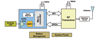 每個(gè)無線傳感器都被看作一個(gè)節(jié)點(diǎn),擁有無線通信能力,同時(shí)還具有一定的信號(hào)處理與網(wǎng)絡(luò)數(shù)據(jù)的智能。根據(jù)應(yīng)用的類型,每個(gè)節(jié)點(diǎn)都可以有一個(gè)指定的地址。圖2顯示了某個(gè)節(jié)點(diǎn)的通用結(jié)構(gòu)圖。它一般會(huì)包括一個(gè)傳感裝置、一個(gè)數(shù)據(jù)處理微控制器,以及一個(gè)無線連接RF模塊。根據(jù)不同的網(wǎng)絡(luò)定義,RF模塊可以起到一個(gè)簡單發(fā)射器或者收發(fā)器 (TX/RX)的作用。進(jìn)行節(jié)點(diǎn)設(shè)計(jì)時(shí),注意電流消耗和處理能力非常的重要。微控制器的內(nèi)存非常依賴于所使用的軟件棧。