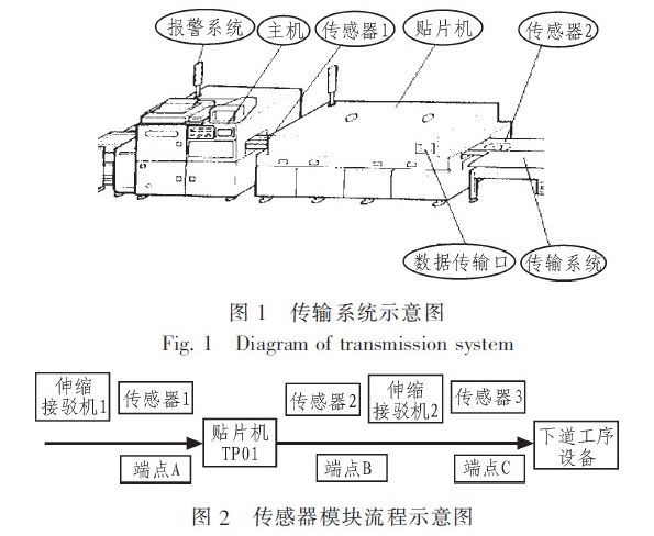 如傳感器流程示意圖1、圖2所示,假設(shè)一塊PCB的編號為01,首先從通過傳輸設(shè)備伸縮接駁機(編號為CS01)進入設(shè)備貼片機(編號為TP01)進行操作貼片流程,完畢之后再從貼片機(編號為TP01)進入傳輸設(shè)備接駁機(編號為CS02),再通過傳輸設(shè)備接駁機(編號為CS02)進入下一個SMT生產(chǎn)設(shè)備,如此反復(fù)。