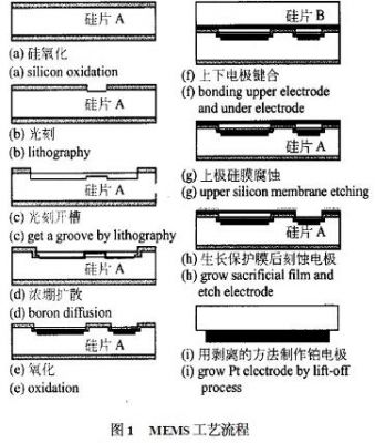硅電容式壓力傳感器的敏感元件是半導(dǎo)體薄膜,它可以由單晶硅、多晶硅等利用半導(dǎo)體工藝制作而成。典型的電容式傳感器由上下電極、絕緣體和襯底構(gòu)成。當(dāng)薄膜受壓力作用時,薄膜會發(fā)生一定的變形,因此,上下電極之間的距離發(fā)生一定的變化,從而使電容發(fā)生變化。但電容式壓力傳感器的電容與上下電極之間的距離的關(guān)系是非線性關(guān)系,因此,要用具有補償功能的測量電路對輸出電容進行非線性補償。由于高溫壓力傳感器工作在高溫環(huán)境下,補償電路會受到環(huán)境溫度的影響,從而產(chǎn)生較大的誤差?;谀P妥R別的高溫壓力傳感器,正是為了避免補償電路在高溫環(huán)境下工作產(chǎn)生較大誤差而設(shè)計的,其設(shè)計方案是把傳感器件與放大電路分離,通過模型識別來得到所測環(huán)境的壓力。高溫工作區(qū)溫度可達350℃。傳感器件由鉑電阻和電容式壓力傳感器構(gòu)成。其MEMS工藝如下: