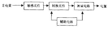 傳感器是將各種非電量(包括物理量、化學量、生物量等)按一定規(guī)律轉(zhuǎn)換成便于處理和傳輸?shù)牧硪环N物理量 (一般為電量)的裝置。傳感器一般由敏感元件、轉(zhuǎn)換元件和測量電路三部分組成,有時還需外加輔助電源。 傳感器方框圖如圖1所示。