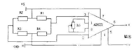 我們選用的高精度低噪聲儀用放大器AD620,可以用在傳感器輸出信號小的放大器中,如光電池傳感器、應變片傳感器以及壓力傳感器等。由于它具有低噪聲、增益精度高、增益溫度系數(shù)小和高線性度等優(yōu)良性能。用于此系統(tǒng)中是非常理想的。AD620是一種只用一個外部電阻就能設置放大倍數(shù)為1-1000的儀表放大器,具有良好的直流性能和交流性能,AD620的體積小、功耗低成為應用在壓力傳感器中的重要因素,傳感器信號放大電路如圖5所示。
