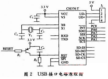 USB接口電路主要由文件管理控制芯片CH376T實現(xiàn),CH376T支持USB設備方式和USB主機方式,并且內(nèi)置了USB通信協(xié)議的基本固件、處理MassStorage海量存儲設備的專用通信協(xié)議的固件、SD卡的通信接口固件、FAT16和FAT32以及FAT12文件系統(tǒng)的管理固件,支持常用的USB存儲設備和SD卡。CH376T支持二種通信接口:SPI接口和異步串口。本設計采用SPI接口與MCU進行數(shù)據(jù)通信,電路連接方式如圖2所示。串行數(shù)據(jù)輸入SDI、輸出SDO和時鐘SCK分別接STM32F103VC的SPI1_MOSI,SPI1_MISO和SPI1_SCK,中斷請求輸出端INT接PC0,片選端SCS由PA1控制。圖2中的RESET是系統(tǒng)復位信號,晶體振蕩器Y1選12 MHz。當車主要進行指紋注冊/刪除或應急點火時,將密碼鑰匙(U盤)接入J1以讀取密碼信息。