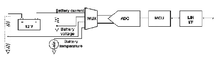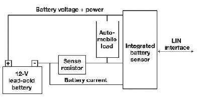 電池電壓通過(guò)一個(gè)直接從電池正極分接出來(lái)的阻性衰減器來(lái)檢測(cè)。為檢測(cè)電流,將一個(gè)檢測(cè)電阻(12V應(yīng)用一般使用100mΩ)放在電池負(fù)極與地之間。在這種配置中,汽車的金屬底盤(pán)一般為地,檢測(cè)電阻安裝在電池的電流回路中。在其它配置中,電池的負(fù)極是地。對(duì)于SoH 計(jì)算,還必須檢測(cè)電池的溫度?! ?br />