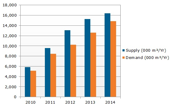 根據(jù)NPD DisplaySearch觸控感應(yīng)器產(chǎn)能統(tǒng)計(jì)報(bào)告Touch Sensor Manufacturing Capacity指出,2011年主要的觸控傳感器,包含電阻式、投射式電容、單片式投射式電容(sensor-on-cover)和面板內(nèi)嵌式投射式電容(on-cell)觸控感應(yīng)器的總產(chǎn)量為960萬平方米,較2010年的580萬平方米取得了66%的年增長率。NPD DisplaySearch預(yù)測(cè),2012年觸控感應(yīng)器將達(dá)到1千3百萬平方米,并將于2014年上升到1千640萬平方米。