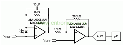 圖2所示為分立光電二極管電路,從圖中可以看出,該電路需要一個或多個運(yùn)算放大器:一個用于電流到電壓的轉(zhuǎn)換,可能還需要一級放大,提供附加增益。它還包括一些分支電路,用于供電,確保高度可靠的信號鏈。而在空間極其寶貴的應(yīng)用中,所需元件的數(shù)量過多可能導(dǎo)致空間受限問題。