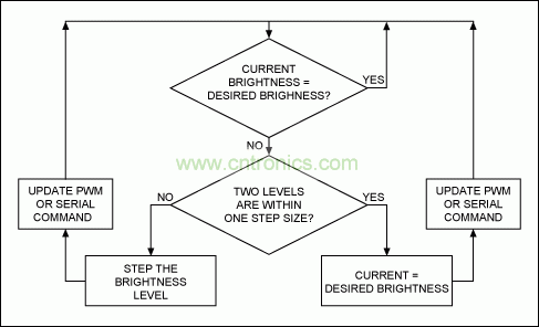 最好不要從一個亮度級直接跳轉(zhuǎn)到另一個亮度級,而是平滑上調(diào)和下調(diào)背光亮度,確保不同亮度等級之間無縫過渡。為了達(dá)到這一目的,最好采用帶有固定或不同亮度步長、可逐步調(diào)節(jié)亮度的定時中斷,也可采用帶有可控制LED輸入電流的PWM值的定時中斷,或者是能夠發(fā)送到顯示屏控制器的串行指令的定時中斷。圖8提供了這種算法的一個示例。