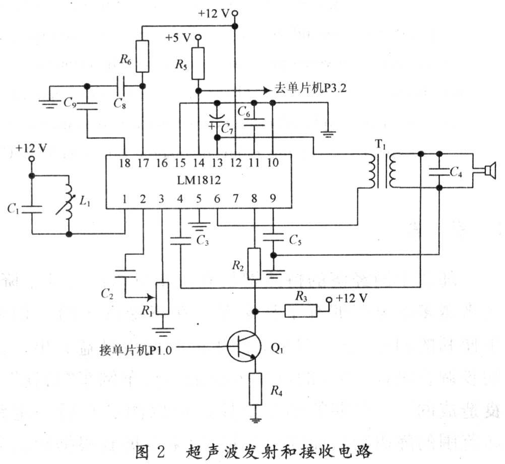 超聲波發(fā)射和接收電路如圖2所示。當(dāng)LM1812的8腳為高電平時,LM1812處于發(fā)射模式;當(dāng)8腳為低電平時,LM1812處于接收模式。值得注意的是,單片機到LM1812的連接要進行5~12 V的電平轉(zhuǎn)換。當(dāng)LM1812處于發(fā)射模式時,L1,C1振蕩槽路被切換為振蕩模式,振蕩信號經(jīng)驅(qū)動放大后,由13腳及6腳輸出。6,13腳之間所接變壓器線圈的匝數(shù)比是根據(jù)TCF40-25TR1型收發(fā)一體式超聲波傳感器的阻抗來確定的。實驗證明,變壓器線圈的匝數(shù)比大約為4:1時可實現(xiàn)與超聲波發(fā)送器阻抗相匹配。超聲波接收器接收到的超聲波信號經(jīng)電容耦合由4腳輸入,再經(jīng)內(nèi)部兩級放大后同由1腳的諧振回路取出的信號一起送到檢測器。當(dāng)檢測到超聲波回波信號時,LM1812的14腳(與單片機的INT0端相連)變?yōu)榈碗娖剑箚纹瑱C的T0計數(shù)器停止計數(shù)。