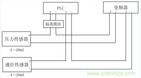 對于傳感器輸出的電流信號,只經PLC和變頻器的輸入阻抗之和不大于傳感器的輸出負載阻抗即可,壓力傳感器的信號可以同時串入PLC和變頻器,如只有壓力傳感器信號,則PLC和變頻器也都可以正常接收壓力傳感器的信號。而當液位傳感器的信號也同時接入PLC和變頻器時,因PLC接收信號的-端都在變頻器的+端,當兩傳感器的信號電流不一樣時,就有可能使PLC兩-端的電位有較大的差異,就就形成了共模干擾電壓。如PLC輸入端又互相不是隔離的,則會造成PLC的模擬信號輸入端接收不正常。變頻器的兩輸入信號是在PLC的后面,其-端電位可保持在變頻器內部電路設定的狀態(tài),問題不大。