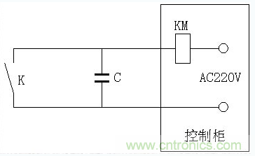 有時PLC或其它控制器的開關量輸入由于受外界干擾影響而瞬間輸入錯誤,導致PLC產生誤動作,這時在PLC的輸入端并上一個0.1uF的小電容就可以消除這種干擾,如下圖所示:
