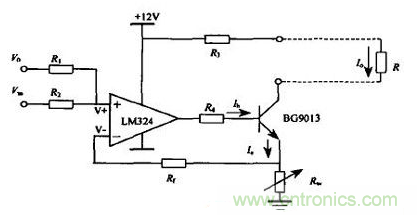 由圖1可見,電路主要元件為一運(yùn)算放大器LM324和三極管BG9013及其他輔助元件構(gòu)成,V0為偏置電壓,Vin為輸入電壓即待轉(zhuǎn)換電壓,R 為負(fù)載電阻。其中運(yùn)算放大器起比較器作用,將正相端電壓輸入信號與反相端電壓V-進(jìn)行比較,經(jīng)運(yùn)算放大器放大后再經(jīng)三極管放大,BG9013的射級電流Ie作用在電位器Rw上。