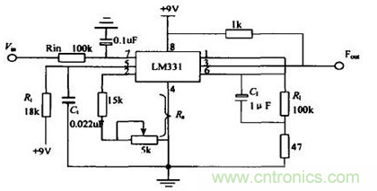 電阻Rs、R1、Rt和電容Ct直接影響轉(zhuǎn)換結(jié)果Fout,因此對元件的精度要有一定的要求,可根據(jù)轉(zhuǎn)換精度適當(dāng)選擇,其中Rt、Ct、Rs、R1要選用低溫漂的穩(wěn)定元件,Cin可根據(jù)需要選擇0.1uF 或1uF 。電容C1對轉(zhuǎn)換結(jié)果雖然沒有直接的影響,但應(yīng)選擇漏電流小的電容器。電阻R1和電容C1組成低通濾波器,可減少輸入電壓中的干擾脈沖,有利于提高轉(zhuǎn)換精度。電路中的47Ω 電阻對確保電路線性失真度小于0.03% 是十分必須的。