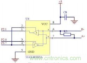 單片機(jī)C8051F020的P2.0、P2.1及P3.7通過MAX485與PC機(jī)相連,進(jìn)行串行通信,如圖4所示。P3.7控制MAX485的狀態(tài),接收或發(fā)送,用軟件控制。P2.1為單片機(jī)的串行輸入端,接收PC機(jī)通過MAX485向單片機(jī)發(fā)送的數(shù)據(jù),P2.0為單片機(jī)的串行輸出端,通過MAX485發(fā)送給PC機(jī)。