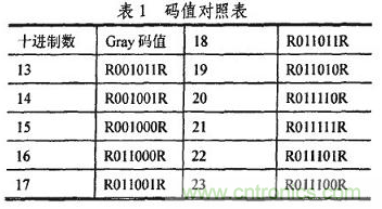 編碼采用格雷碼(Gray)為數(shù)值碼,以某一固定碼寬為參考碼R,它用于標尺定位和提高精度。Gray碼是一種絕對編碼方式的無權(quán)碼,它所具有的循環(huán)、單步特性能消除隨機取數(shù)時出現(xiàn)重大誤差的可能,其任意兩個柏鄰整數(shù)之間轉(zhuǎn)換時,只有一個位數(shù)發(fā)生變化,大大減少了由一個狀態(tài)轉(zhuǎn)到下一個狀態(tài)時的邏輯混淆,具有較強的容錯能力。以6位編碼為例,其部分十進制數(shù)與Gray碼的一一對應關(guān)系如表1所示。