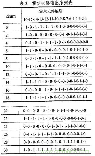 霍爾電路的工作原理是,在外磁場的作用下,當磁感應強度B超過導通工作點時,霍爾電路輸出管導通,輸出低電-半:若曰值低于釋放點時,輸出管截止,輸出高電半。因此在“凸槽”時鋼質(zhì)活塞桿被磁化,磁感應強度曰增加,霍爾電路導通,輸出低電平,用“1”表示;在“凹槽”時輸出高電平,用“0”表示。以第1個霍爾元件為測量基準,從圖2所示時刻起,位移暈旃次變化b=2mm時,一個碼區(qū)行程內(nèi)霍爾電路輸出的二進制序列如表2所示。分析可知,序列的標識碼為l 0000000 1,其前面或后面6位序列數(shù)分別為相鄰的兩個數(shù)值碼,這使它具有很強的容錯能力。標識碼每隔一個霍爾元件間距N在低位部分右移一位。值得注意的是,標識碼前面的數(shù)值碼代表磁性標尺當前檢測位置下一個碼區(qū)的值。