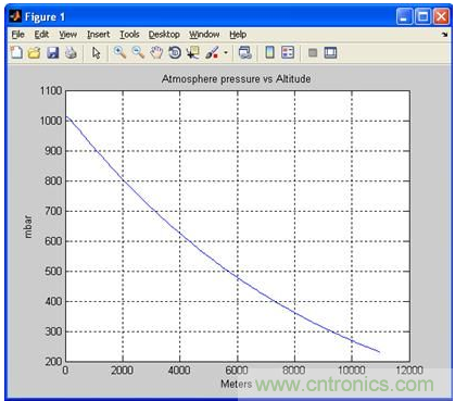 其中:P0 是標準大氣壓,等于1013.25 mbar;Altitude是以米為單位的海拔高度。P是在某一高度的以mbar為單位的氣壓,圖1根據(jù)上面的公式描述了大氣壓變化與海拔高度的關系。