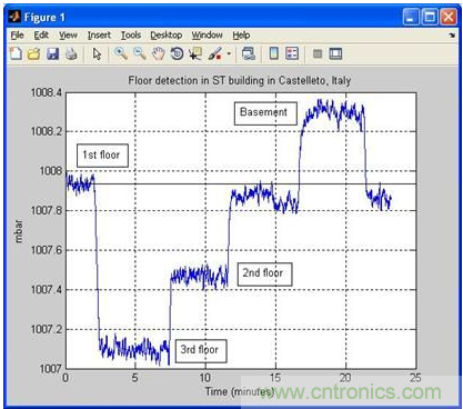 圖2所示是在意法半導體的意大利Castelletto寫字樓內(nèi)采集到的壓力傳感器數(shù)據(jù)。采樣速率是7Hz,數(shù)據(jù)采集時間總計大約23分鐘。從圖中我們可以清晰地看到大氣壓在不同樓層的變化。大氣壓在地下室最高。隨著樓層升高,大氣壓逐漸降低。