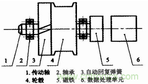 基于磁敏角度技術(shù)的拉線式位移傳感器的功能是將拉線的機(jī)械位移換成可以計(jì)量、記錄或傳送的電信號,主要由自動回復(fù)彈簧、輪轂、磁鐵以及數(shù)據(jù)處理單元等部分構(gòu)成,結(jié)構(gòu)如圖1所示。
