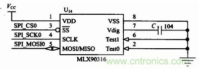 由于串行通信的輸出信號直接來自于MLX90316的內(nèi)部DSP輸出,SPI輸出模式更穩(wěn)定,誤差更小,并且具有更高的抗干擾能力。在本設(shè)計(jì)中,選用SPI接口,具體的硬件接口連接電路如圖3所示。在圖3中,MLX90316的SPI三根線與ARM LPC2136的SPl0口連接。SPI(SerialProtocol InterIace)總線接口是一種同步串行外設(shè)接口。這是一個4根信號線的串行接口協(xié)議,包括主、從兩種模式。這4根信號線分別是:時鐘線(SCK)、數(shù)據(jù)輸入線(MISO)、數(shù)據(jù)輸出線(MOSI)和從設(shè)備使能線(SS)。