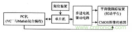該系統(tǒng)主要由平面鏡跟蹤裝置、控制和驅(qū)動(dòng)電路、方位限位電路、CMOS圖像傳感器(附巴德膜濾波片)等部分組成。系統(tǒng)總體設(shè)計(jì)框圖如圖1所示。跟蹤裝置實(shí)物圖如圖2所示,圖像傳感器固定在平面鏡中心。圖像傳感器產(chǎn)品主要分為CCD,CMOS以及CIS傳感器三種。目前CMOS型不僅價(jià)格低廉,而且已經(jīng)實(shí)現(xiàn)數(shù)字化輸出,軟件可編程控制,大大降低系統(tǒng)設(shè)計(jì)的難度,提高系統(tǒng)設(shè)計(jì)的靈活性、抗干擾性和穩(wěn)定性。
