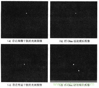 圖4為拍攝到太陽(yáng)光斑存在干擾時(shí)的圖像,對(duì)比圖4(a)和圖4(b)可發(fā)現(xiàn)用Otsu法分割處理后,能有效消除圖像中細(xì)微干擾。圖4(c)由Otsu法處理后得到圖4(d),光斑圖像坐標(biāo)(160,120),光斑個(gè)數(shù)為2,對(duì)應(yīng)FYP和FWP為O。由此判斷拍攝的圖像存在明顯干擾,程序?qū)YP和FWP置為O,確保系統(tǒng)的可靠性。