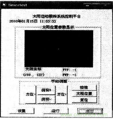 一般情況下使用圖像傳感器跟蹤,但當(dāng)陰天或出現(xiàn)厚云層時(shí),太陽(yáng)光斑無(wú)法出現(xiàn)在傳感器視角內(nèi),VC++立即調(diào)用時(shí)鐘算法,根據(jù)太陽(yáng)在天空中每分鐘運(yùn)動(dòng)的角度,計(jì)算出跟蹤控制器5 min應(yīng)轉(zhuǎn)動(dòng)的角度,從而確定出步進(jìn)電機(jī)的轉(zhuǎn)速,使得裝置根據(jù)太陽(yáng)位置而相應(yīng)變動(dòng)。