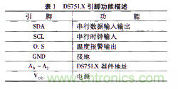 DS75LX工作電壓為1.7 V到3.7 V。除了基本的測溫功能外,DS75LX還具有溫度報(bào)警功能,允許用戶通過軟件設(shè)置報(bào)警溫度的門限值。DS75LX測溫范圍為-55℃~+125℃,當(dāng)測溫范圍為-25℃~+100℃時,測量精度為±2℃。DS75LX同時具有可編程的9至12位的溫度數(shù)據(jù)輸出格式。輸出的溫度數(shù)據(jù)為12位時,其分辨率可達(dá)0.0625℃。該傳感器具有三個地址引腳,可設(shè)置為三種狀態(tài)中的任意一種:接GND、VDD,或懸空,可設(shè)置27種地址組合。例如A2、A1和A0分別為接電源、接地和懸空時,DS75LX的器件地址為0101110。圖1是DS75LX的引腳排列,各功能描述如表1所示。