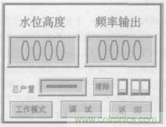 系統(tǒng)中采用觸摸屏作為人機(jī)界面,顯示操作畫(huà)面,進(jìn)行參數(shù)修改和指令輸入。通過(guò)觸摸屏可實(shí)現(xiàn)水位上升、下降高度等參數(shù)的設(shè)定和修改,實(shí)現(xiàn)實(shí)際水位高度變化、輸出振蕩頻率和總產(chǎn)量等的實(shí)時(shí)顯示等,并可對(duì)工作進(jìn)程進(jìn)行實(shí)時(shí)監(jiān)控。