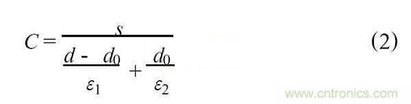 式中,S為極板相互遮蓋面積,單位為m2;d為兩平行板間的距離,單位為m;ε為極板間介質(zhì)的介電常數(shù);εr極板間介質(zhì)的相對(duì)介電常數(shù);ε0真空的介電常數(shù)。從上式可以看出,當(dāng)d小時(shí)可使電容量增大,而使靈敏度增加,但d過(guò)小容易引起電容器擊穿,一般我們可以采取在極板間放置云母來(lái)改善,此時(shí)電容C為兩電容串聯(lián),可寫(xiě)成: