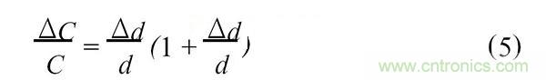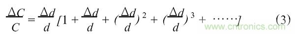 最后要說(shuō)明的是關(guān)于非線性的問(wèn)題。由下圖我們可以看到變間隙式電容傳感器相對(duì)輸出表達(dá)式為: