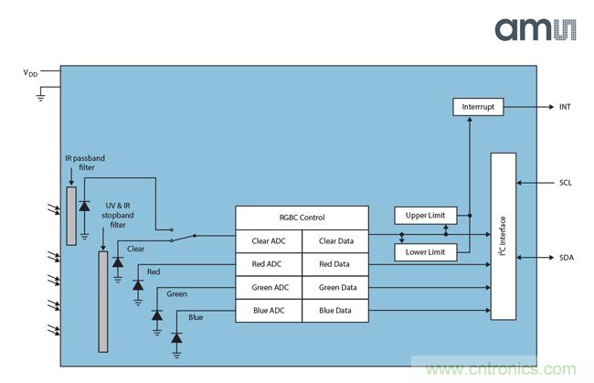 四個獨立的模擬數字轉換器(ADC)分別對應一個RGB通道, C通道和紅外線通道共用第四個模擬數字轉換器。四個通道同時取樣能避免快速變化的光照條件下CCT和光照強度的測量出錯。TCS3490傳感器的光電二極管被安排在一個輻射狀結構上,因此光線從任意方向射入都能獲得一致的有效響應,尤其是從圓形的窗口中射入的光。當光線測量值或顏色測量值超過預設的閾值時,傳感器會向處理器發(fā)送中斷信號,避免處理器不停地通過I2C接口輪詢,幫助降低整個系統(tǒng)的功耗,延長電池壽命。