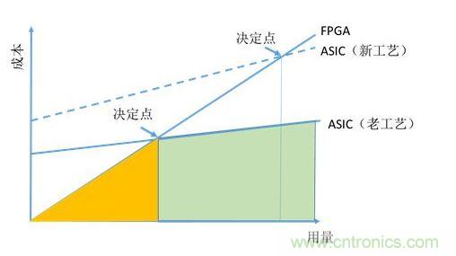 從上圖可以看出,F(xiàn)PGA由于沒有NRE,在用量較小的時(shí)候成本優(yōu)勢明顯。由于FPGA單個(gè)芯片成本高于ASIC,所以有較大斜率。在決定點(diǎn)位置以后,ASIC開始有成本優(yōu)勢。所以從成本因速考慮選用FPGA還是ASIC,與用量有很大關(guān)系。