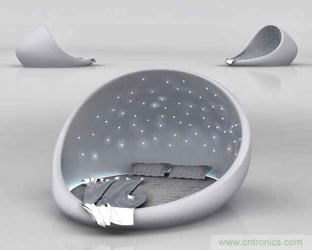 The Cosmos Bed由白色玻璃纖維制成,形狀酷似雞蛋和太空艙,內(nèi)置床墊可根據(jù)需要調(diào)節(jié)傾斜度。其特別之處在于,采用了柔和的LED照明系統(tǒng)模擬星光效果,配合寧靜的音樂及戶外特有的氣味,讓你在舒適放松的感覺下進(jìn)入甜美夢鄉(xiāng)。The Cosmos Bed還自帶鬧鈴設(shè)備,就算到了該起床的時(shí)間,也不用擔(dān)心睡過頭。