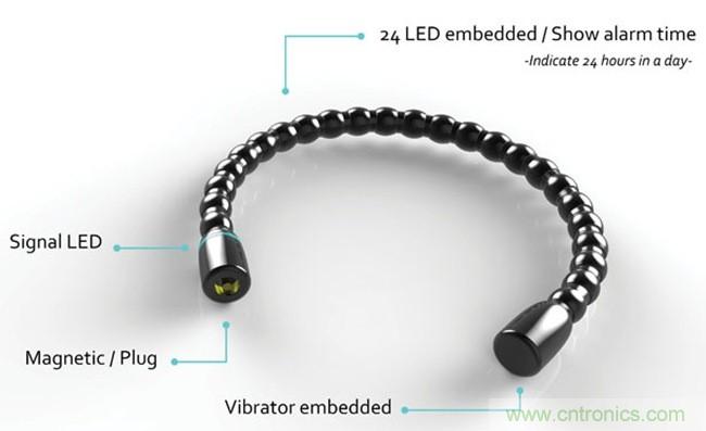 而手鏈采用磁性連接頭作為連接環(huán),連接頭上有指示燈,通過(guò)不同的顏色來(lái)指示電池的電量,連接頭也有USB接口,可以通過(guò)適配器來(lái)為智能手鏈充電。同時(shí)這款智能手鏈內(nèi)置了藍(lán)牙模塊,可以通過(guò)藍(lán)牙連接智能手機(jī),用戶可以通過(guò)手機(jī)程序來(lái)設(shè)置鬧鐘時(shí)間,讓智能手鏈用溫柔的震動(dòng)喚醒自己。