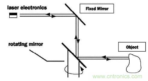 這套發(fā)射/接收組件和旋轉(zhuǎn)鏡面結(jié)合在一起,能掃描至少一個平面。鏡面不只反射二極管發(fā)出去的光,而且也能把反射回來的光再反射給接收器。通過旋轉(zhuǎn)鏡面,能夠?qū)崿F(xiàn)90到180度的視角,并且大大降低系統(tǒng)設(shè)計和制造的復(fù)雜度,因為鏡面是這里面唯一的運動機構(gòu)。