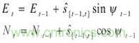方程式2表述航位推算(DR)算法,該方法是基于步數(shù)計算,而不是加速度和角速率的積分運算。方程式2的航位推算過程有三個要素:1)在t-1 (Et-1, Nt-1)時最后一次已知的用戶絕對位置(用東北坐標(biāo)系表示);2)從t-1到t()的步長;3)從時間t-1開始的航向 (ψ) 可以算出新位置相對已知位置(Et-1, Nt-1)的坐標(biāo)(Et, Nt),如方程式2所示。