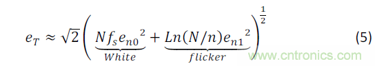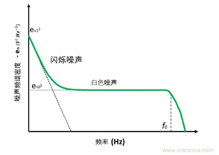 噪聲最由兩個(gè)因素造成:1/f閃爍噪聲和熱噪聲(見(jiàn)圖2)。閃爍噪聲是大自然中常有的噪聲,而它旳頻譜密度和地球自轉(zhuǎn)速度、海底水流、天氣以至氣候現(xiàn)象等活動(dòng)相關(guān)。研究報(bào)告顯示普通蠟燭的閃爍速率是1/f 。在MOS器件和放大鏈各元素中,閃爍噪聲則是技術(shù)工藝誤差生成的缺陷,使電荷被困于柵極氧化物內(nèi)所造成的結(jié)果。電荷進(jìn)出這些“陷阱”,造成晶體管通道內(nèi)的電流不穩(wěn)定 [6],故又稱(chēng)「隨機(jī)電報(bào)噪聲」(random telegraph noise,RTS)。利用洛倫茲數(shù)學(xué)模型(Lorentzian mathematical model) 可以形容每一個(gè)“陷阱”的共振行為,而模型的總和(即MOSFET通道表面范圍的所有“陷阱”總和)在1/f頻譜上展示時(shí),會(huì)全完符合具體噪聲的頻譜密度。結(jié)果顯示,1/f波幅與MOSFET通道表面面積成反比──而不是完全直觀。