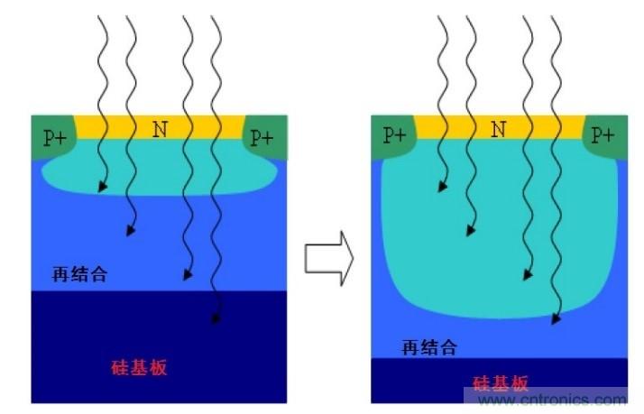 因?yàn)檫@個(gè)原因,ITCCD不能從BSI中獲益。而高端CCD因?yàn)槭褂么怪笨箷灩に?,所以沒(méi)有這一限制。而CMOS也具有同一特點(diǎn):在薄的感測(cè)層上,因?yàn)殡姾刹粫?huì)在像素之間滲透,所以沒(méi)有串?dāng)_的缺點(diǎn)。結(jié)果是ITCCD和標(biāo)準(zhǔn)CIS都能夠?qū)崿F(xiàn)良好的空域解析度或調(diào)制轉(zhuǎn)換函數(shù)(modulated transfer function,MTF) 。要增加NIR部份和敏感度,需要顯著增加物料厚度,但是厚物料會(huì)增加光電串?dāng)_,引致MTF衰減。成像質(zhì)量是MTF和QE的綜合結(jié)果(即所謂的檢測(cè)量子效率Detective Quantum Efficiency,DQE),所以必需同時(shí)考量空域和時(shí)域因素。圖6顯示利用硅摻雜方法恢復(fù)MTF的深耗盡(deep depletion)光電二極管。一般來(lái)說(shuō),CIS使用類(lèi)似集成電路的常用技術(shù)(特別是DRAM/內(nèi)存工藝)生產(chǎn),所以不會(huì)牽涉上述的特定工藝配方。不過(guò)近期的技術(shù)研究文章展示適用于CIS的特定工藝導(dǎo)入方案,能實(shí)現(xiàn)出色的QE改進(jìn)甚至相對(duì)接近高端CCD的水平(見(jiàn)圖5)。最新的CMOS技術(shù)趨勢(shì)可說(shuō)是突飛猛進(jìn),引進(jìn)了如導(dǎo)光板、深槽隔離(deep trench isolation,DTI)、埋藏微透鏡,以及在光敏范圍下嵌入包含像素晶體管的迭層芯片等技術(shù)。