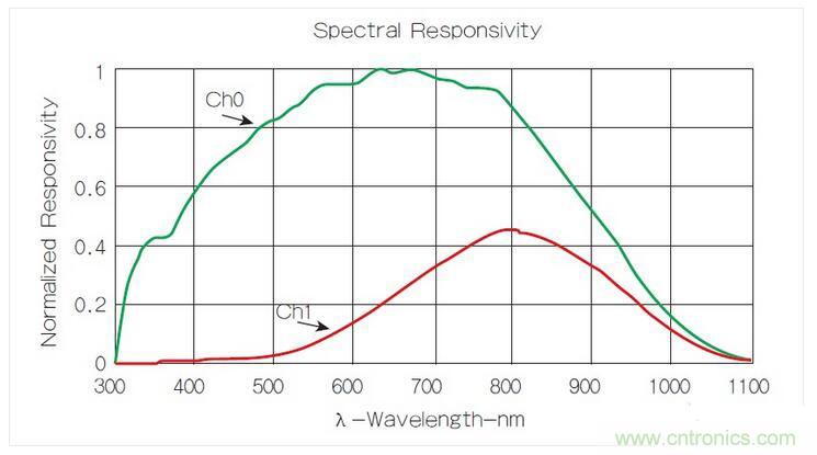 艾邁斯半導(dǎo)體已針對這個(gè)問題提出一個(gè)更好的解決方案:雙二極管(dual-diode)模塊。其中一個(gè)光電二極管(如圖2中所示的Channel 0)用來感測全光譜,另一個(gè)(圖中的Channel 1)則主要用來感測光譜中的紅外線部分。從全光譜傳感器的輸出中減掉紅外線光電二極管的輸出,則可得到可見光的測量結(jié)果。