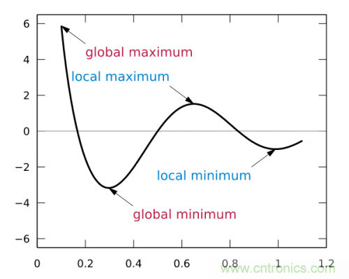這樣,斜率為0時我們其實就得到了函數(shù)f在該點可以得到最小值。那么,把x向左或者向右移一點,到底移多少呢?如果移多了,可能移過了,如果移得很少,則可能要移很久才能找到最小點。還有一個問題,如果f(x)操作函數(shù)有多個局部最小點、全局最小點時,如果x移的非常小,則可能導致通過導數(shù)只能找到某個并不足夠小的局部最小點。如下圖所示: