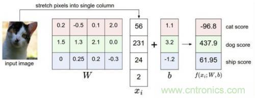 比如我們有訓練數(shù)據(jù)集照片對應(yīng)著cat、dog、ship三個類別,某個輸入照片經(jīng)過函數(shù)f(x)=x*W+b,前向運算得到該照片屬于這3個分類的得分值。此時,這個函數(shù)被稱為得分函數(shù),如下圖所示,假設(shè)左邊關(guān)于貓的input image是一個4維向量[56,231,24,2],而W權(quán)重是一個4*3的矩陣,那么相乘后再加上向量[1.1,3.2,-1.2]可得到在cat、 dog、ship三個類別上的得分: